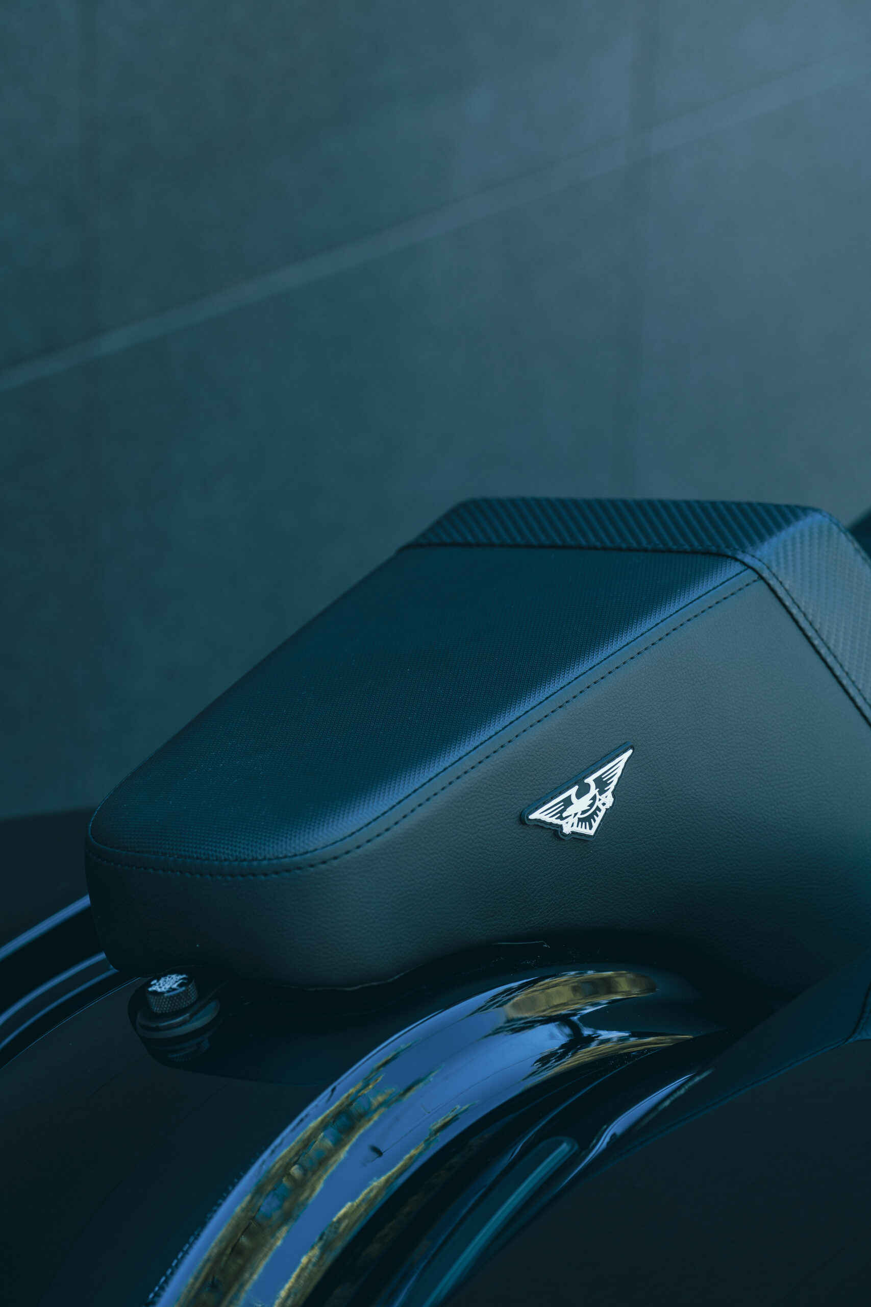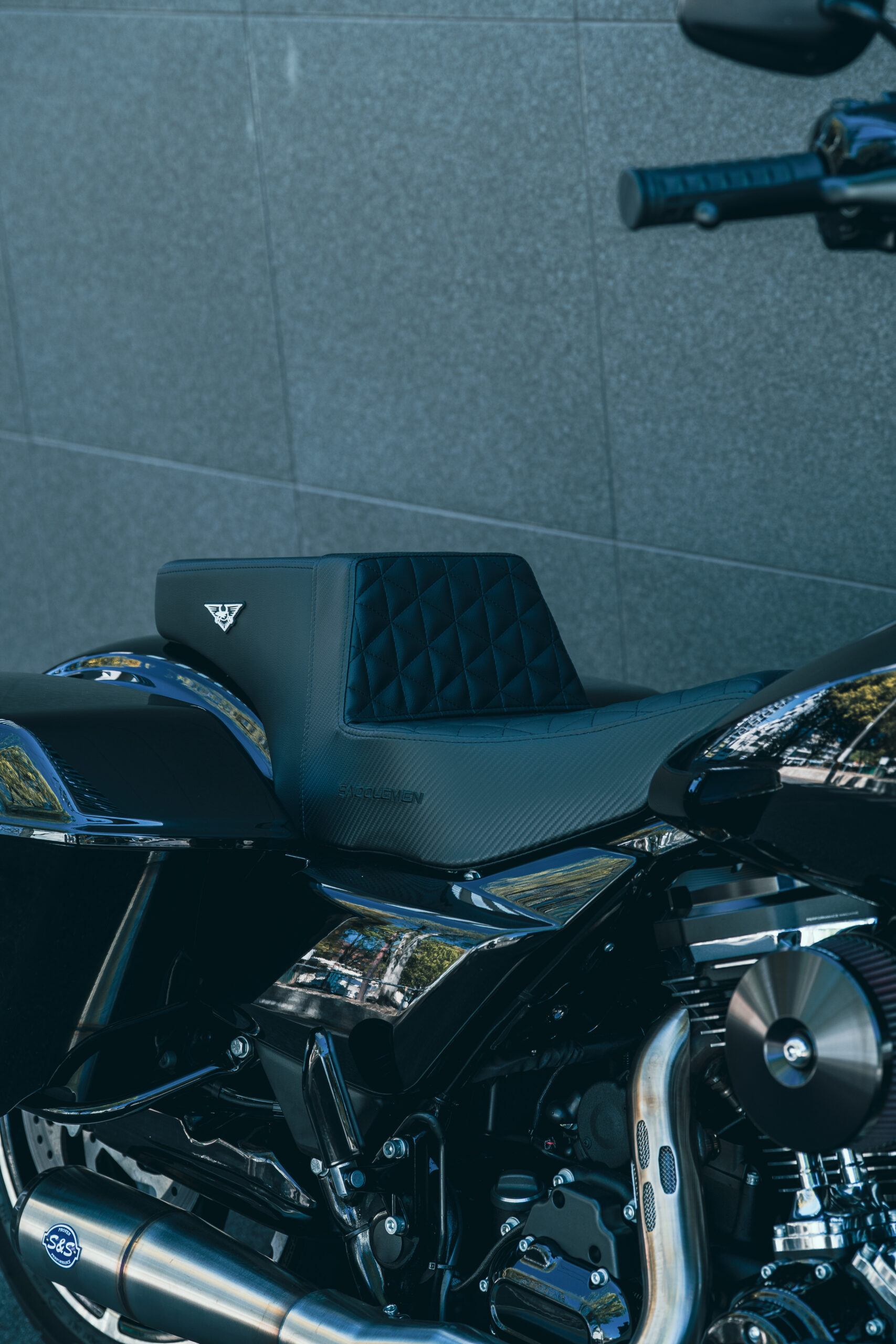 ライダーポジションは定番のダブルダイアモンドステッチ。サイドはカーボン調の素材を選択