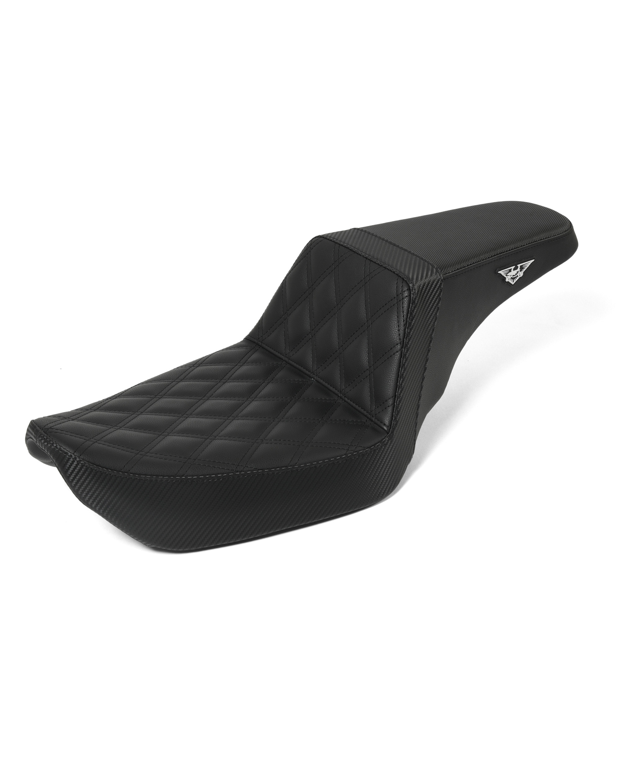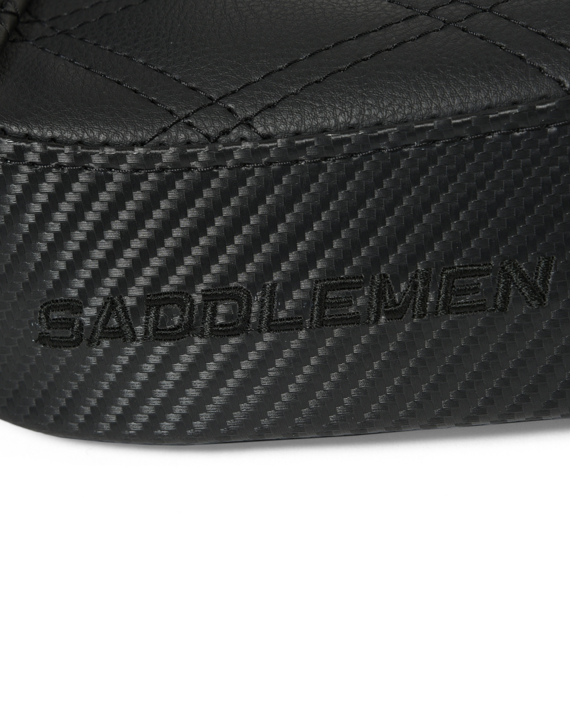 ライダーポジションは定番のダブルダイアモンドステッチ。サイドはカーボン調の素材を選択